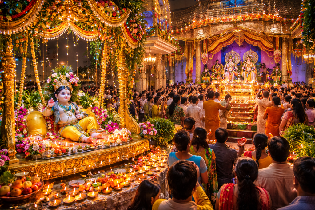 The image captures the powerful and devotional atmosphere of Hanuman Jayanti as celebrated at the renowned Chopla Hanuman Mandir in Ghaziabad. The scene unfolds during the daytime, filled with energy, devotion, and vibrant cultural expression as thousands of devotees gather to honor Lord Hanuman, the symbol of strength, devotion, and courage. At the heart of the celebration stands a grand idol of Lord Hanuman, richly adorned with marigold garlands, sacred ornaments, and traditional attire. The idol radiates divine presence, with Lord Hanuman depicted in a blessing posture while holding the gada (mace), representing power and protection. Surrounding the idol, oil lamps burn brightly, adding a sacred glow to the gathering. The temple complex and surrounding streets are filled with processions carrying decorated palanquins and idols, moving rhythmically through the area. Devotees dressed in saffron and white attire chant Hanuman Chalisa and devotional slogans, while orange flags wave high above the crowd, creating a sea of devotion and unity. Flower petals shower the procession as traditional drums, conch shells, and devotional music fill the air. The atmosphere is festive yet deeply spiritual, reflecting collective faith and devotion. The background reveals the beautifully decorated Chopla Hanuman Mandir, enhanced with lights, garlands, and flags, serving as the spiritual center of the celebration.